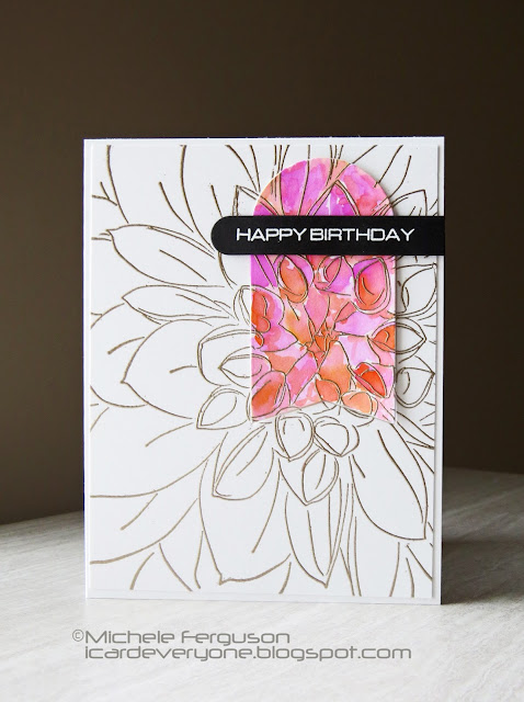 I couldn't help but recreate the saucer, and create a little vellum panel, using the line drawn bloom from the set ... my latte was made using that old Versafine pen I neglect, and white embossing powder. Add a bit of Zig coloring, and my card was done.