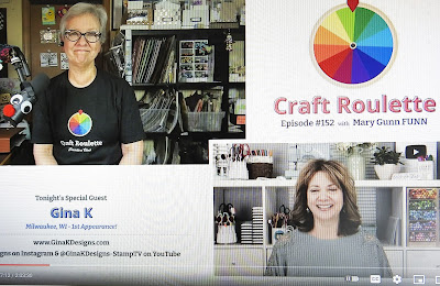 I usually shut down after dinner for a little mindless TV but last evening I couldn't resist Gina K on Craft Roulette! Mary Gunn had SOOO much FUNN with her Episode #152 guest star! We did, too!
